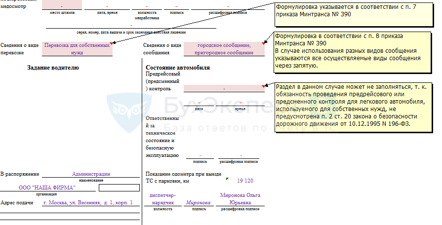 - лица, заполняющего сведения об организации или ИП, о сроке действия путевого листа, о транспортном средстве, о водителе (водителях), о виде перевозки и виде сообщения;