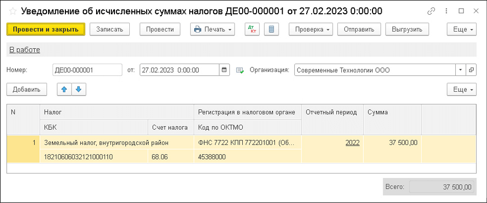 В форме Земельный налог, уведомление за 2022 г. появляется ссылка на созданный документ Уведомление об исчисленных суммах налогов.