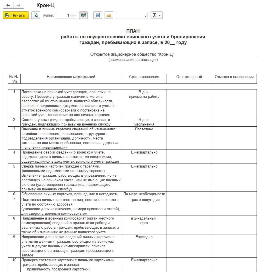 Там же находится для печати Плана работы по осуществлению воинского учета, где для ответственных за ведение ВУ указана периодичность производимых мероприятий. Подается в военкомат ежегодно до 31 декабря
