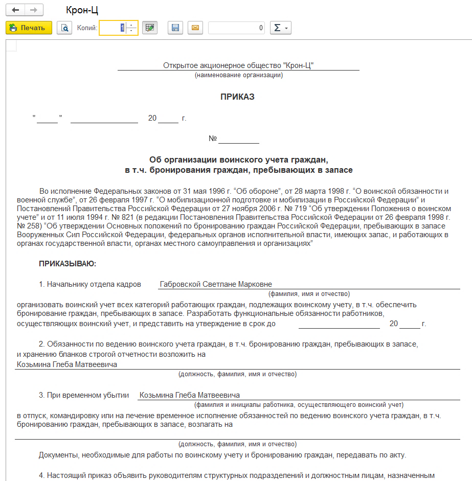 Приказ об организации воинского учета граждан, в т. ч. бронирования граждан, пребывающих в запасе