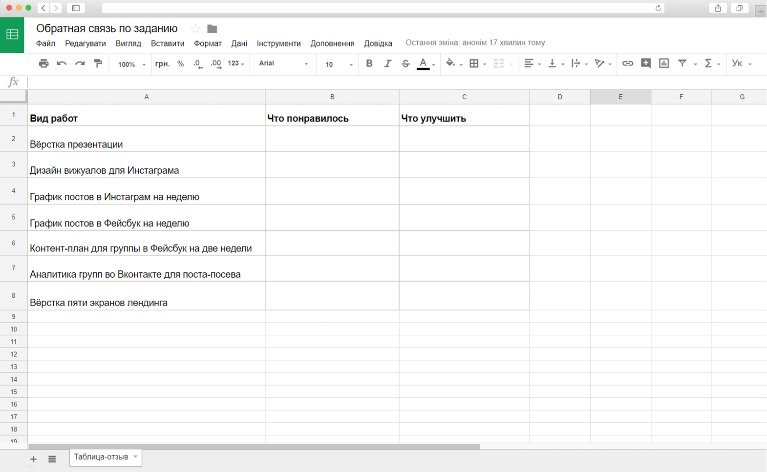 Пример Гугл-таблицы для отзыва. Скопируйте документ и отредактируйте под себя