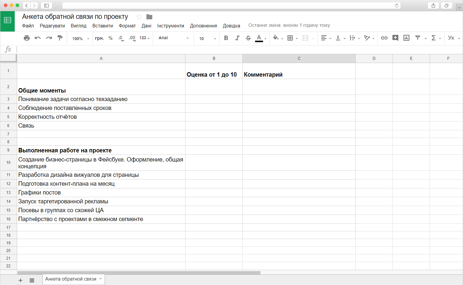 Переходим к ситуации, когда вы завершили работу над большим проектом и хотели бы получить больше чем пару приятных предложений о сотрудничестве. Подготовьте анкету-отзыв о проекте.