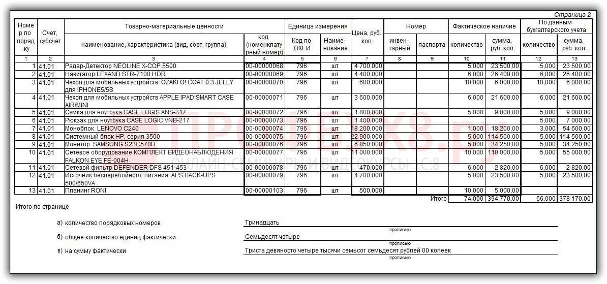 Пример заполнения страницы 2 отчета Инвентаризационная опись товаров (ИНВ-3):