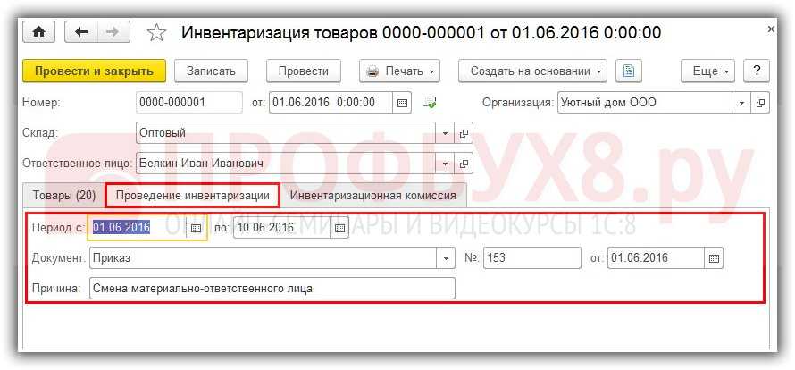 Переходим на закладку «Проведение инвентаризации» и указываем здесь период проведения, причину и документ, утвердивший инвентаризацию: