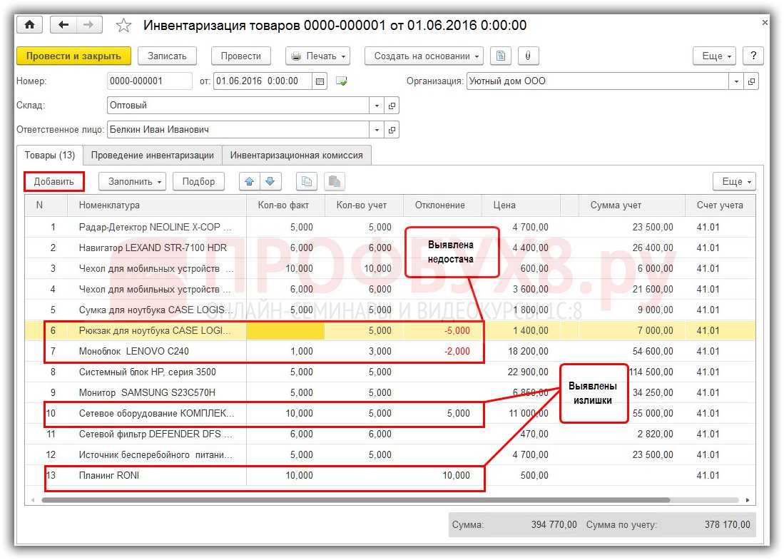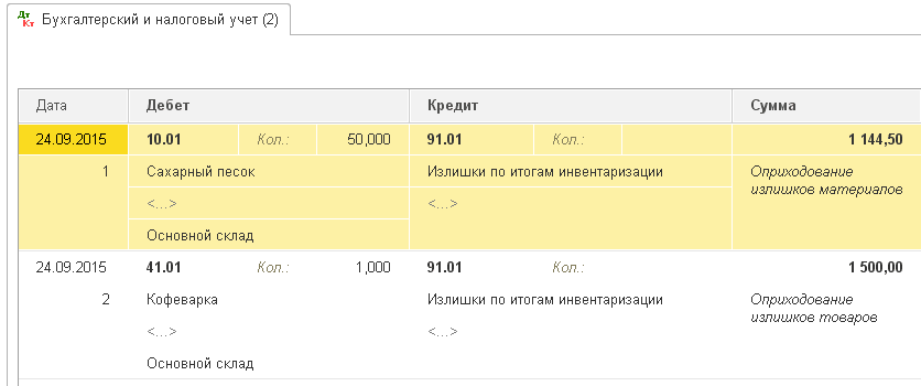 Теперь наша задача списать в учёте выявленную недостачу и оприходовать излишки.