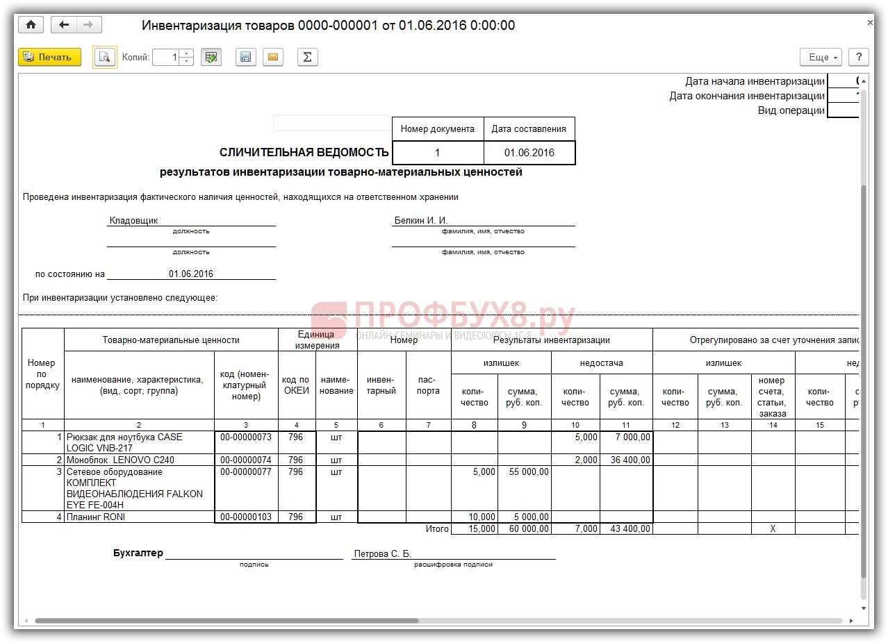 После оформления ведомость подписывают все члены инвентаризационной комиссии. После этого все отчеты направляют в бухгалтерию, которая уже проводит окончательную сверку учетных и фактических данных. Для того, чтобы оформить недостачу, используются специальные унифицированные бланки: