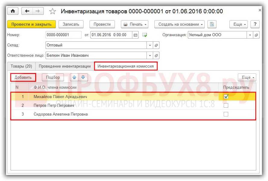 На закладке Инвентаризационная комиссия, используя кнопку Добавить, выбираем членов комиссии из справочника Физические лица. Флажком отмечается сотрудник, который будет назначен в качестве председателя инвентаризационной комиссии: