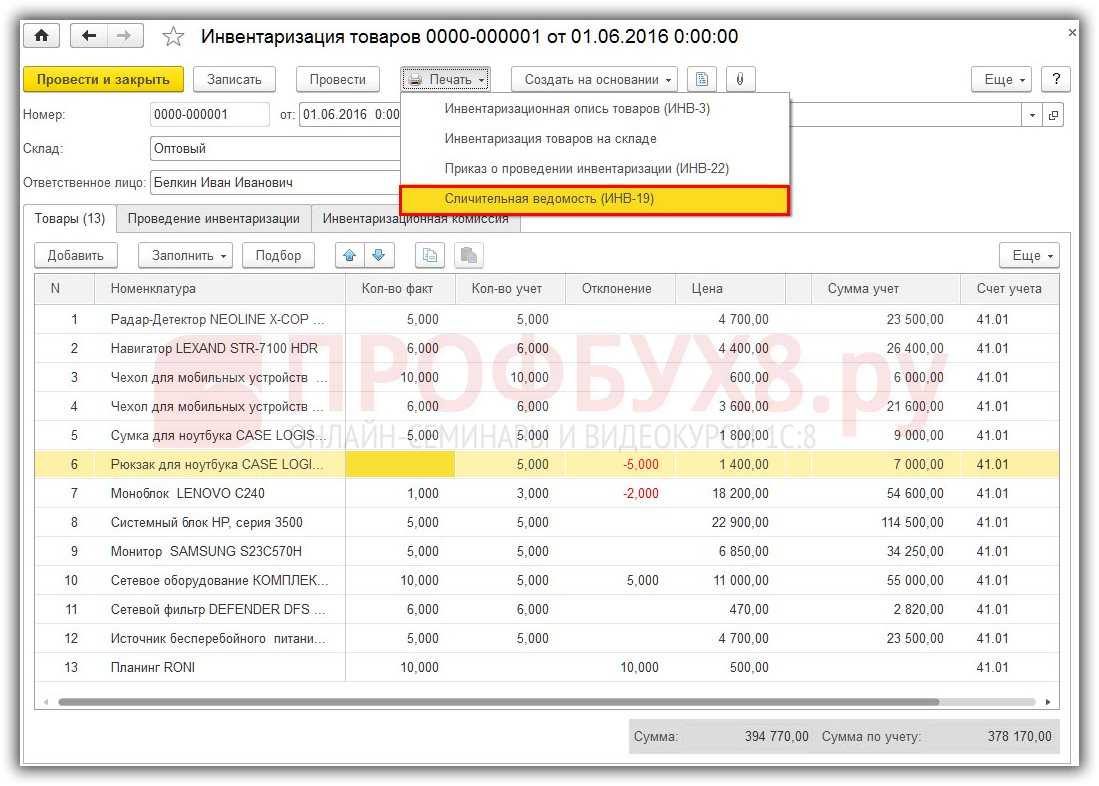 Если по итогам инвентаризации были обнаружены расхождения между учетными и фактическими данными, то в 1С 8.3 можно сделать сличительную ведомость по форме ИНВ-19.