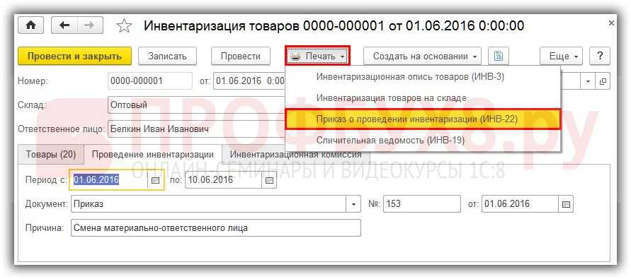 Пример приказа о проведении инвентаризации ИНВ-22: