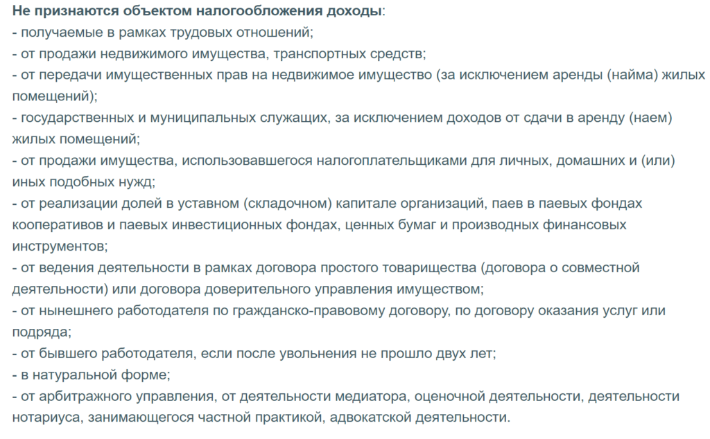 При этом не облагаются НПД доходы, полученные физлицом от следующих видов деятельности: