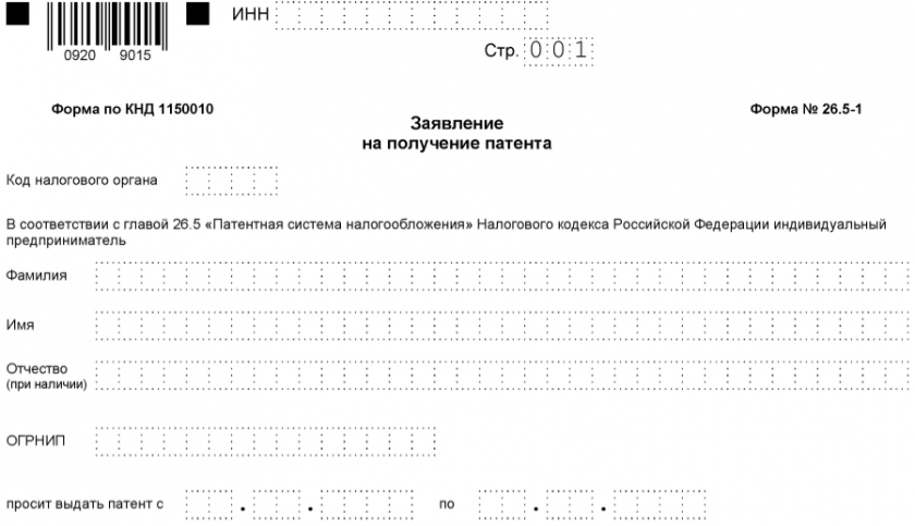 Типовая форма заявления на получение патента утверждена приказом ФНС РФ от 09.12.2020 № КЧ-7-3/891@.