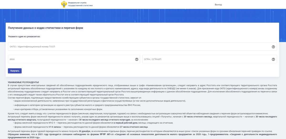 Шаг 3. Вносим реквизиты организации, чтобы узнать, какие формы сдавать в Росстат в 2021 году, и нажимаем «Получить». Она расположена прямо под полями для ввода идентификационной информации субъекта. Система анализирует внесенные реквизиты и практически мгновенно выдает результаты поиска.