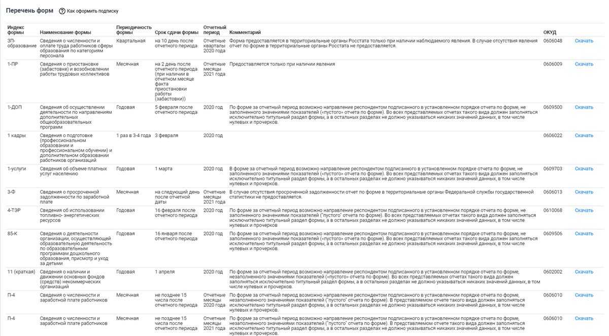 Обратите внимание, что перечень раскрывает информацию не только о наименовании и периодичности предоставления статотчетности. В этом разделе скачайте актуальные форматы отчетов для заполнения в электронном виде
