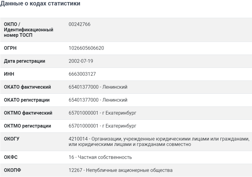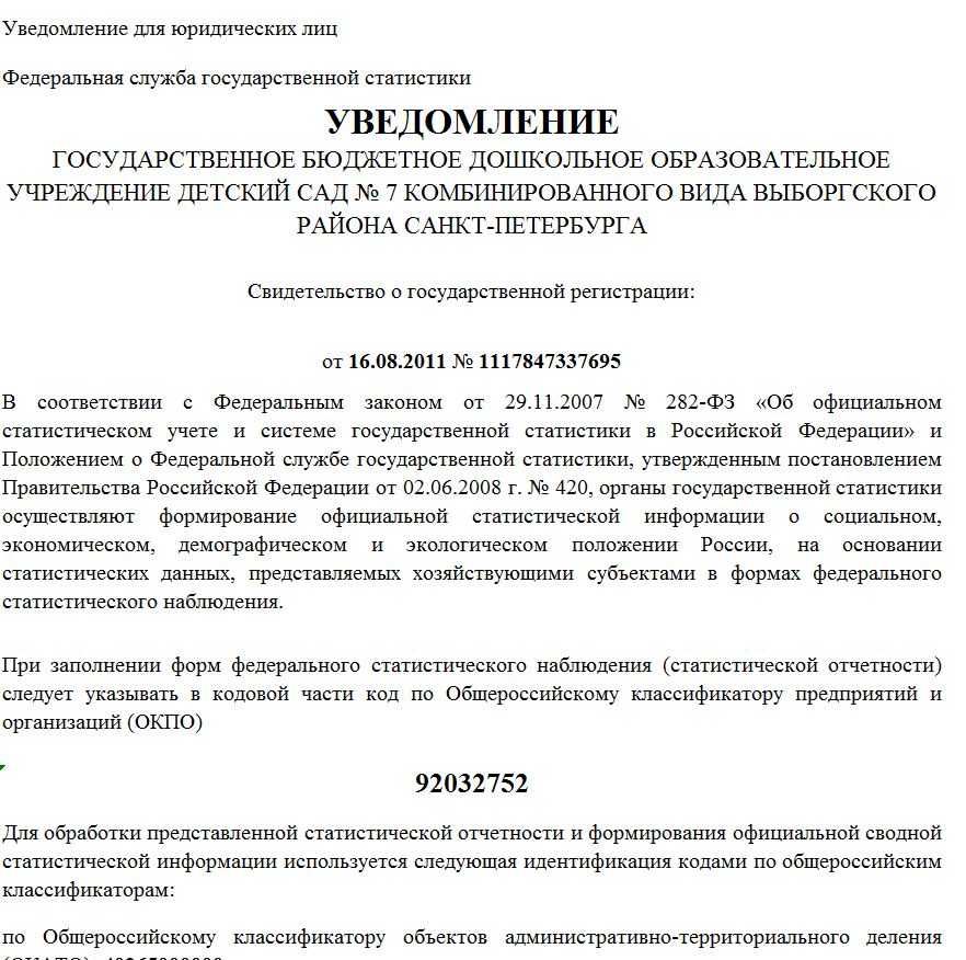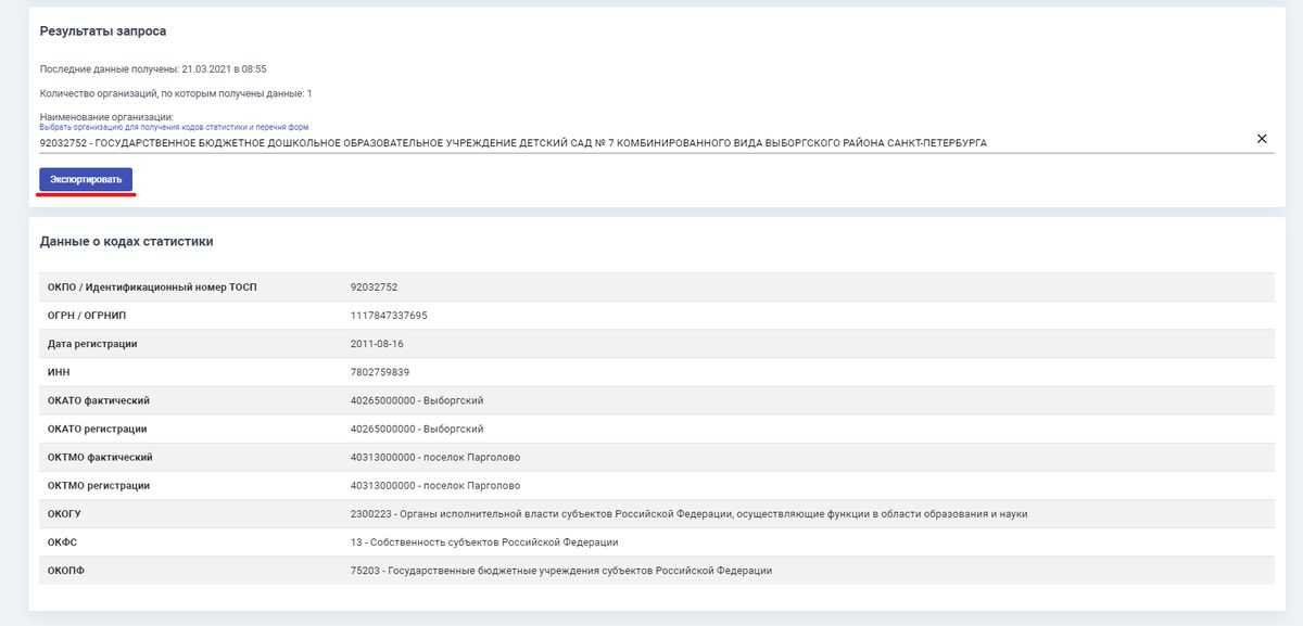 Анализируем полученную информацию. В первой части сформированных результатов поиска размещены регистрационные коды экономического субъекта. Эти шифры содержатся в письме из Росстата, которое направляется организации при первичной постановке на учет. Если письмо потеряется, то шифры уточните на официальном сайте.