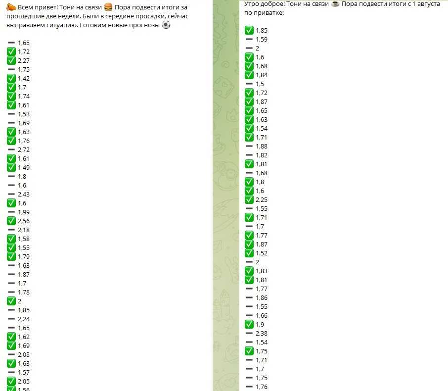 Мы сравнивали прогнозы, которые давал аналитик в бесплатном чате и VIP-группе. Расхождения в коэффициентах и рекомендациях не обнаружено. Время от времени Тони публикует платные прогнозы в общем доступе.