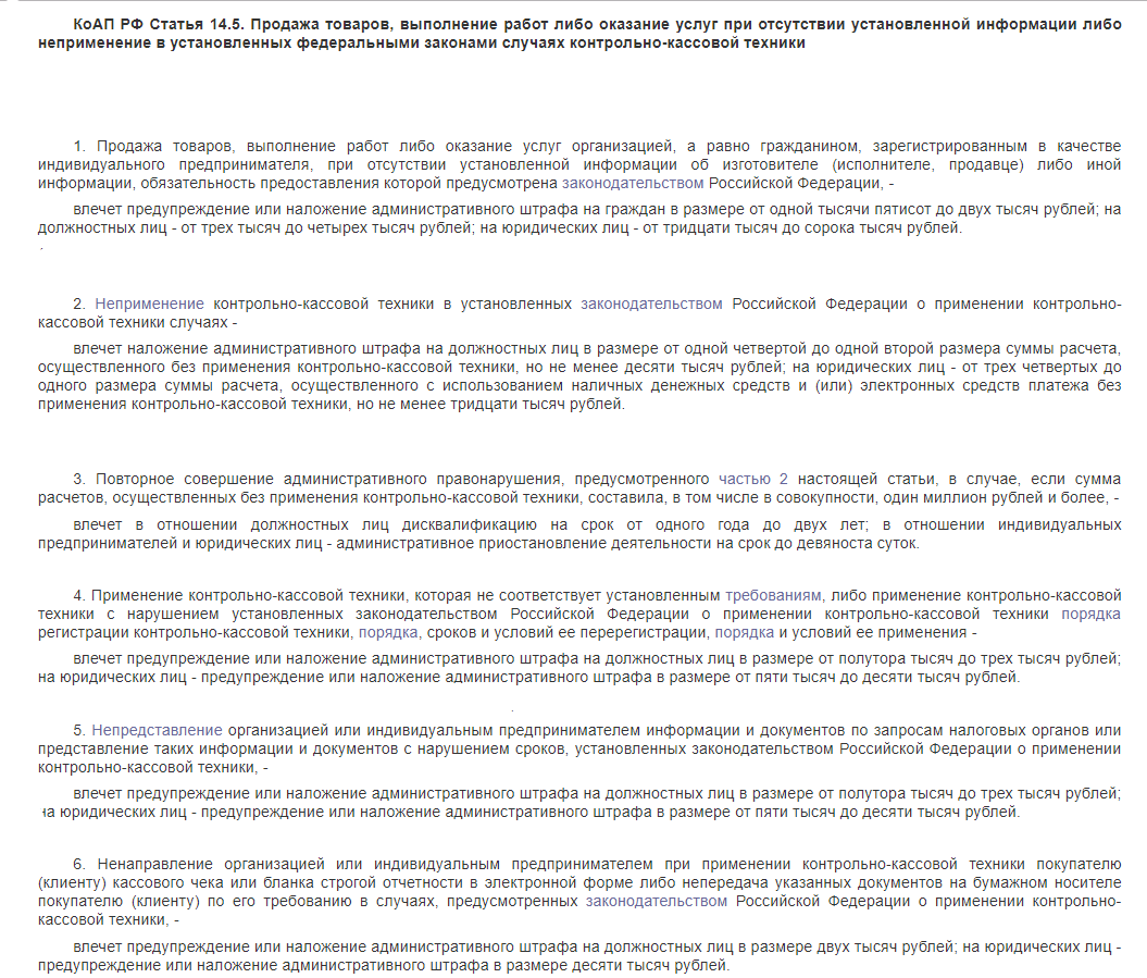 | неиспользование кассового аппарата при расчетах с покупателем | 75%-100% от покупки, минимум 30 тыс. руб. | 25%-50% от покупки, минимум 10 тыс. руб. |