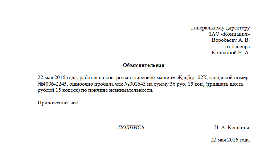 - Объяснительная записка. Как правило, ее составляет кассир, по ошибке которого произошло пробитие неправильного чека. Записка составляется в свободном стиле.