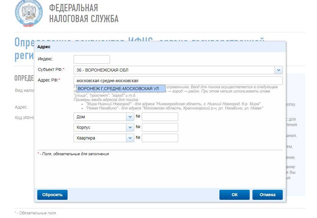 Как узнать на сайте ФНС код фискального органа и муниципального образования по адресу
