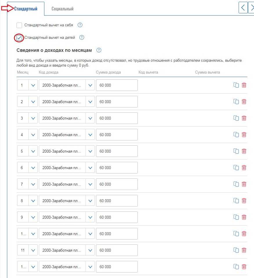 В открывшемся окне выбираем вкладку «Стандартный» и отмечаем, что требуется получить налоговый вычет на детей. А далее из третьего раздела справки 2-НДФЛ построчно переносим информацию о доходе.