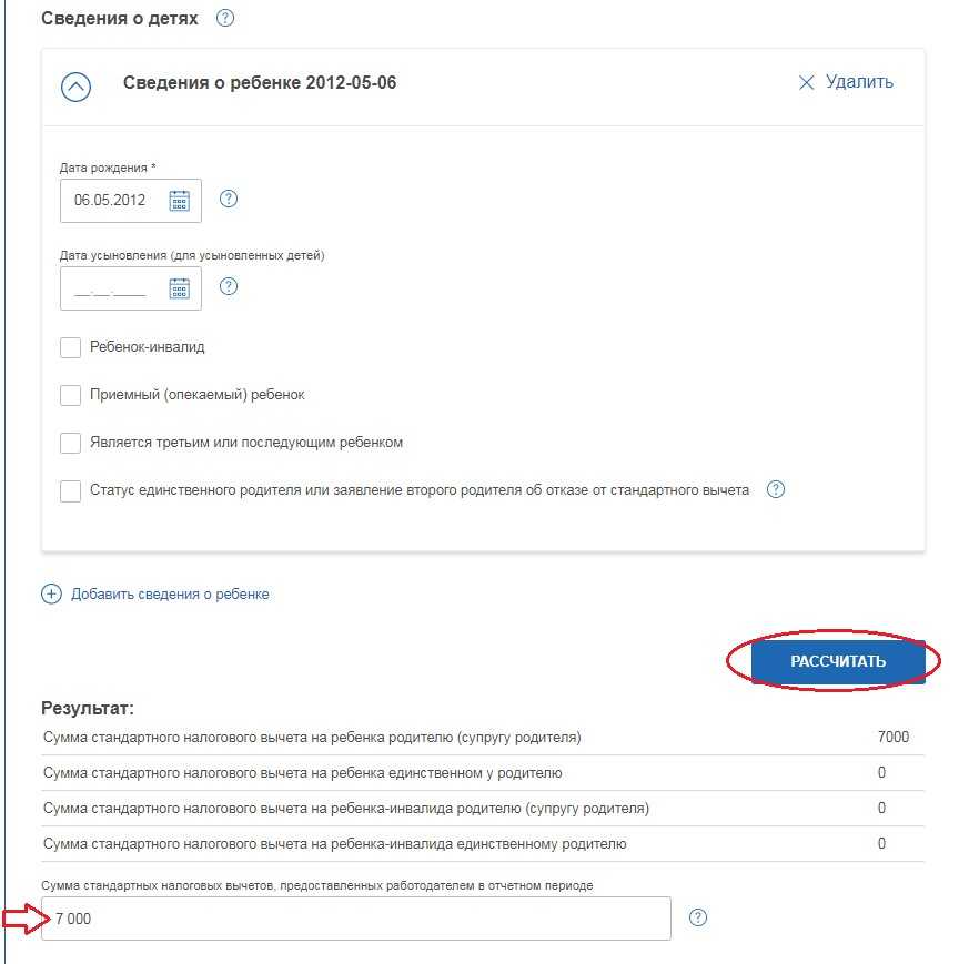Далее указываем информацию о ребёнке и нажимаем кнопку «Рассчитать». После этого в последнее поле необходимо перенести сумму вычета, который предоставил работодатель, согласно четвёртому разделу справки 2-НДФЛ.