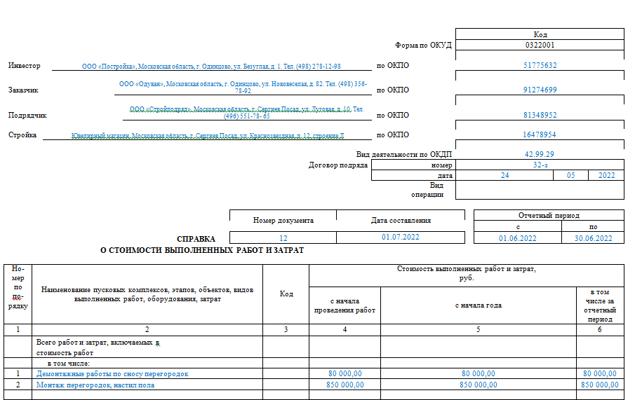 Начинаем заполнение с указания наименований, адресов, телефонов и ОКПО лиц, участвующих в сделке: инвестора, заказчика и субподрядчика.