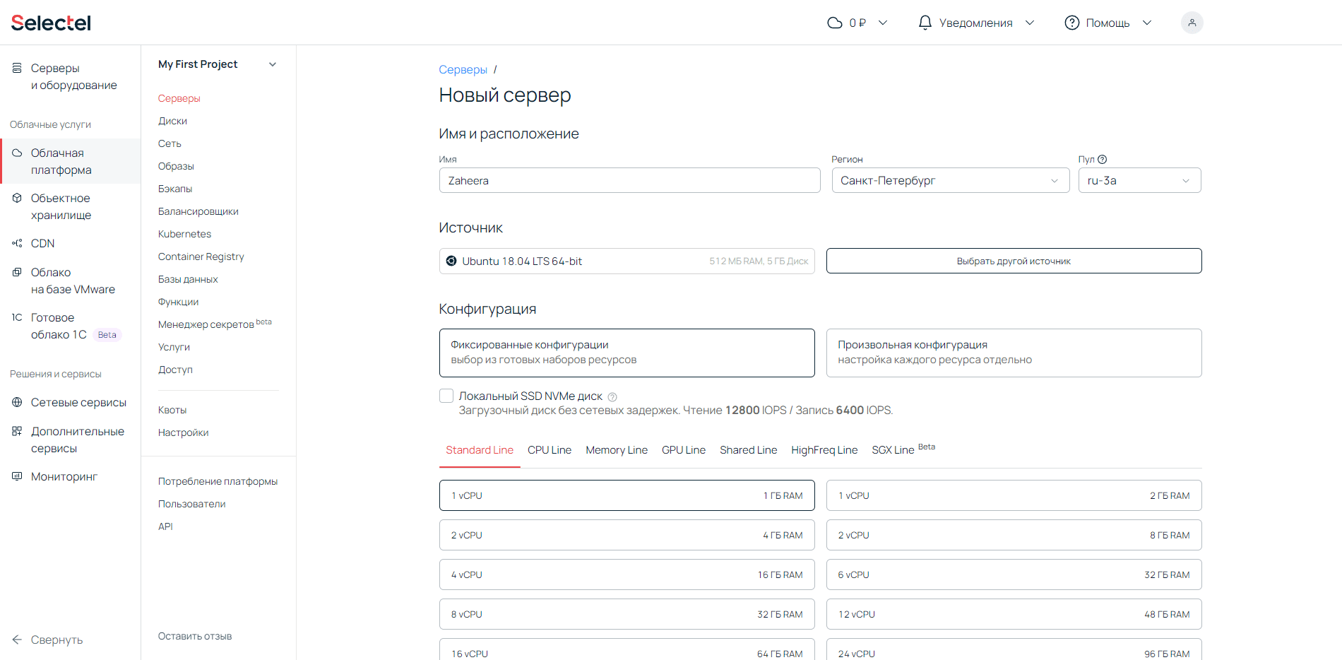 Новых пользователей может запутать многоступенчатое меню при выборе услуг. Нажав на «Облачная платформа», пользователь попадает в новое меню → чтобы начать создание сервера, нужно нажать на кнопку. В панели также долго загружаются страницы, а калькулятор перегружен элементами. На момент написания статьи создание сервера занимает много времени из-за приличного объёма текста.