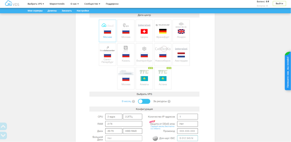 Интерфейс заказа услуги RuVDS