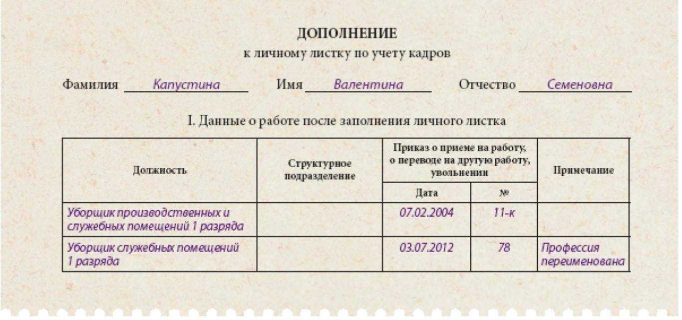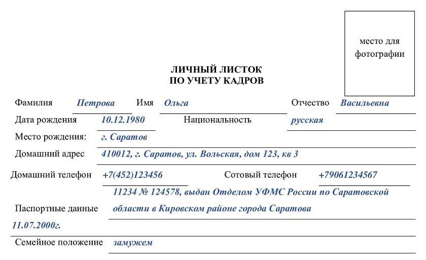 Пример заполнения личного листка по учёту кадров