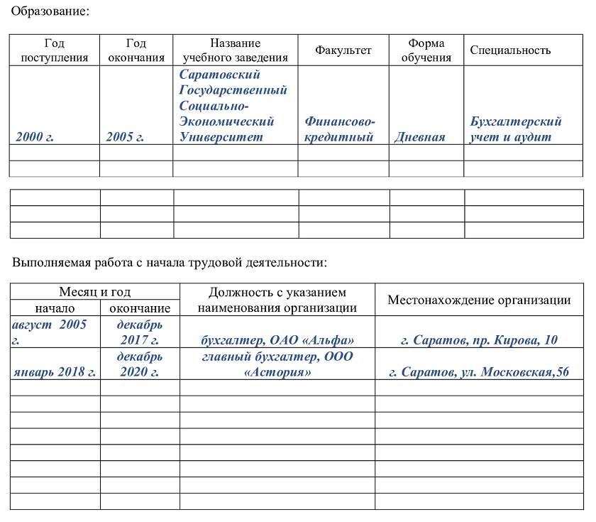 Далее стоят две таблицы об образовании и опыте работы. Если речь идет об образовании, сюда нужно вносить информацию о максимально достигнутом его уровне. То есть если это школа, то указать сведения о ней, если есть среднее специальное или высшее образование, то школу отражать уже не надо. В таком случае достаточно привести информацию о последнем законченном образовательном учреждении.
