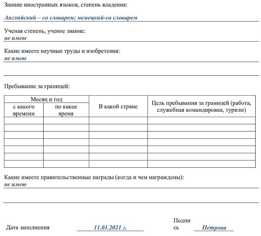 В заключении следует перечислить награды, которые были получены ранее на ниве профессиональной деятельности. Если таковые отсутствуют, строку можно оставить пустой и перейти к завершающему этапу — указанию даты заполнения личного листка и подписи.