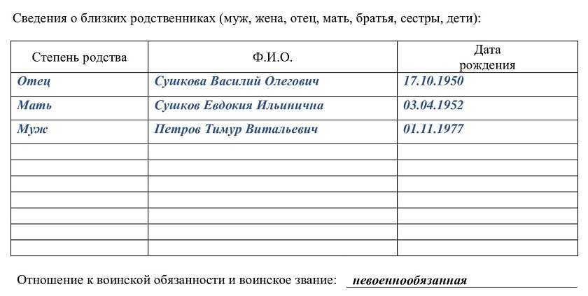 Во вторую часть документа вносится информация о ближайших родственниках.