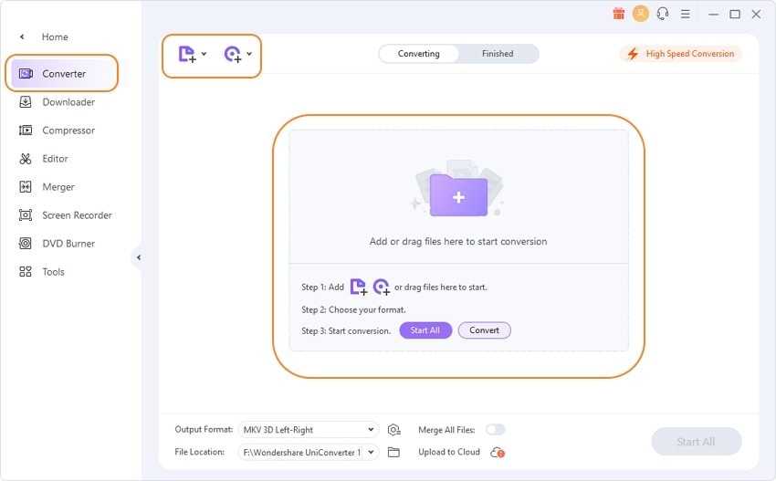 Launch the software after you have downloaded and installed it on your PC/Mac, you’ll come to the Converter interface by default. Click the button on the left-top corner to open the file browser and select videos you want to convert.