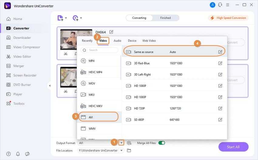 To select an output video format for all files, click on the drop-down icon next to the Output Format: option, which shown on the right-top corner. Then selected your desired video output format under the Video or Device tab. You can customize the video resolution too.
