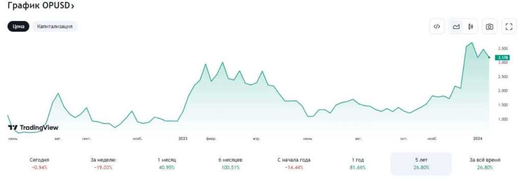 Стоимость монеты OP сейчас находится в районе 3,1 – 3,7 $, преодолев максимальный показатель в своей истории в 3 доллара 20 февраля прошлого года. А своего минимума монета достигла сразу после запуска летом в 2022 году, когда цена упала с 1,16 $ до 0,5 за 15 дней. Однако после корректировки котировок стоимость снова поднялась, преодолев порог в 2 доллара. На данный момент, те инвесторы, которые вложились, смогли получить доход за 2 года в 26,8%.