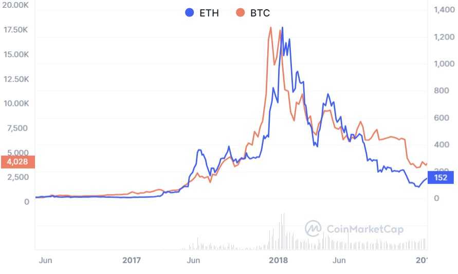 Сравнение динамики стоимости BTC и ETH за последние 7 лет. Источник — CoinMarketCap