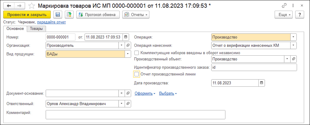 одновременно с вводом продукции в оборот одним документом Маркировка товаров ИС МП. В этом случае в поле Операция указывается операция ввода в оборот, например Производство, а в поле Операция нанесения кодов маркировки указывается Отчет о верификации нанесенных КМ (рис. 4).