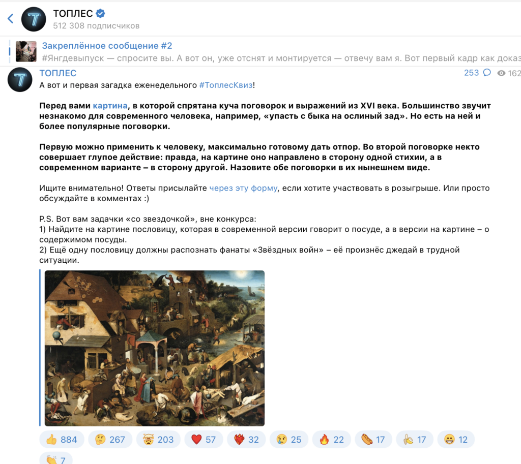 Отличный способ поиграть с аудиторией — дать пользователям задачку или загадать загадку. Главное — придумать что-то по-настоящему интересное, то, что не лежит на поверхности и известно немногим. Так делает канал «Топлес» — авторы используют не простые викторины, а целые задания, над которыми придется поломать голову. Например, читателям нужно найти пословицы, которые спрятаны в картине Питера Брейгеля.