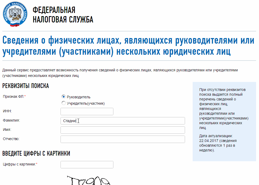Ресурс, на котором проверяют директора предприятия на массовость, разработан налоговым ведомством, регулярно обновляется и предоставляет достоверную информацию: service.nalog.ru/mru.do. Пользоваться следует только этим источником. Помимо проверки на массовость, показываются следующие сведения: