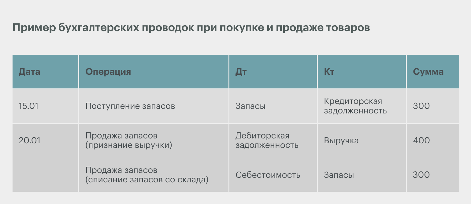 Продажа товара. При продаже товара компания формирует две записи. Первая говорит о том, что компания получила выручку от продажи. Вторая — о том, что запасов этого товара на складе больше нет.