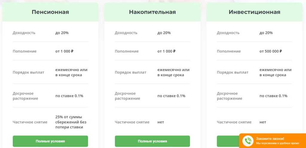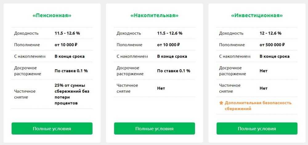 Всего их три: накопительная, пенсионная и инвестиционная, по всем ним предлагается доходность до 8,1% годовых. Инвестиционная, судя по условиям, больше предназначен для предпринимателей, пополнение по ней начинается с 500 тысяч рублей. Также нельзя досрочно расторгнуть договор или снять часть средств со счета раньше времени.