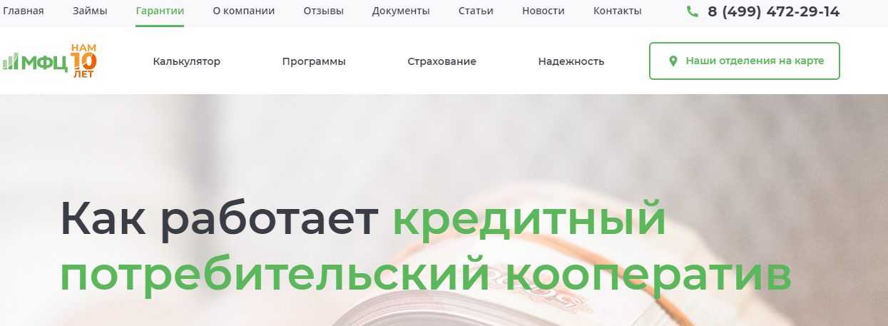 Кооператив МФЦ работает уже давно, это явно не фирма-однодневка. Организация оказывает стандартные для КПК услуги: выдает займы своим пайщикам, а также платит проценты по их сбережениям. Ставка до 9,9% годовых (на июнь 2020 г.). На официальном сайте организации есть удобный онлайн-калькулятор, на котором можно рассчитать, какой доход по сбережениям вы получите (все зависит от сроков заключения договора, суммы вложений). Получать проценты можно на карту своего банка или наличкой в одном из отделений МФЦ (их в Москве четыре). Сам договор с МФЦ можно оформить как в офисе, так и удаленно, связавшись с менеджером и обсудив все детали.