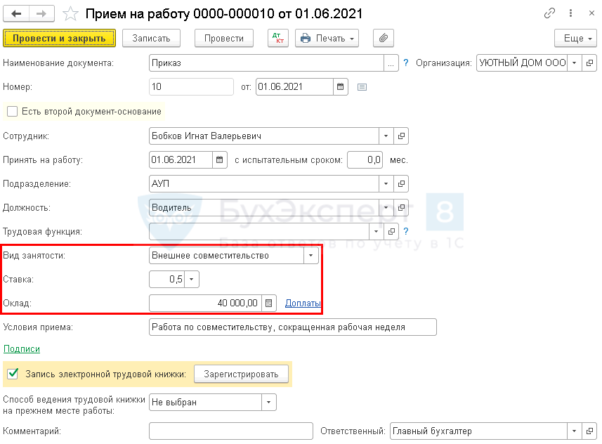 Прием на работу внешнего совместителя оформите документом Прием на работу (Зарплата и кадры — Кадровые документы — кнопка Создать).