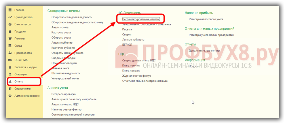 Все отчеты в 1С 8.3 формируются в разделе Отчеты – Регламентированные отчеты: