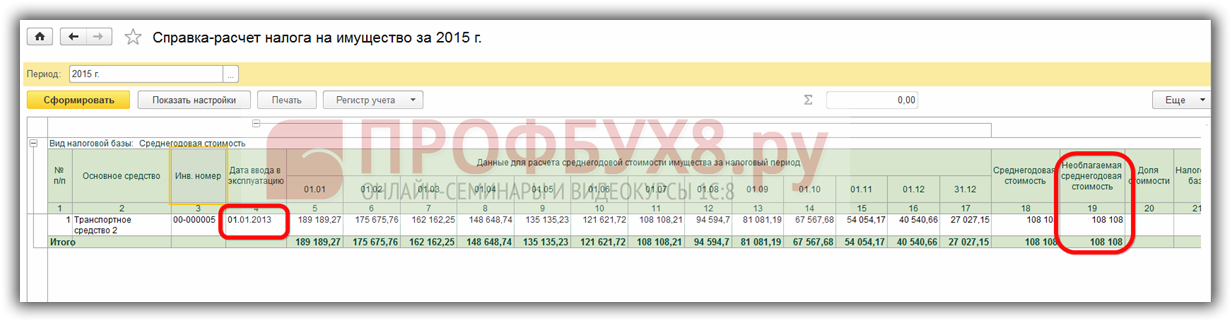 Как видим, в нашем примере есть объекты ОС, которые включаются в налоговую базу, но имеют льготу. Здесь подразумевается льгота на освобождение от налога с 2013 года движимого имущества. В нашем случае это транспортное средство 2, которое было принято к учету 01.01.2013: