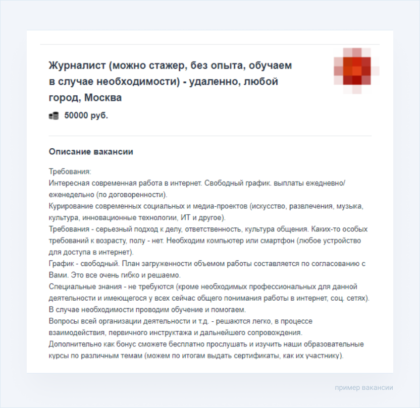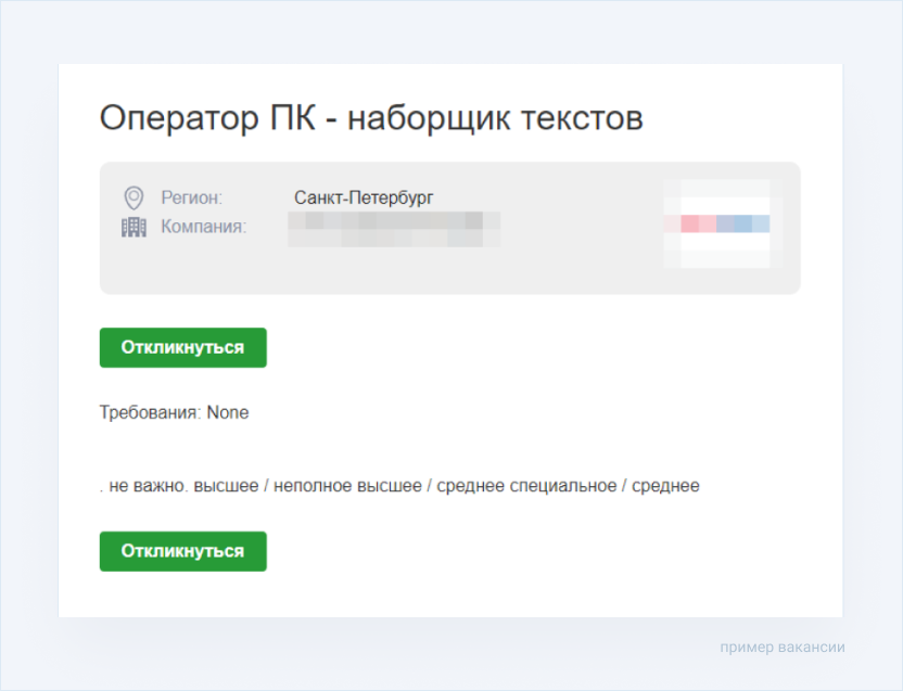 Также отклика нет на вакансии, в которых мало полезной информации. Из расплывчатых формулировок вроде «приходите, работы много, но мы вас всему научим» кандидатам не понятно, в чем именно будут заключаться их обязанности. То же касается и размера денежного вознаграждения. Слишком широкая зарплатная «вилка» (от 10 000 руб. до 100 000 руб.) настораживает. Ниже – пример «водянистой» вакансии.