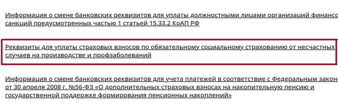 Найти реквизиты для перевода можно на сайте СФР. Выберите свой регион, пролистайте вниз в раздел «страхователям», нажмите на «+»: откроется вся необходимая информация.