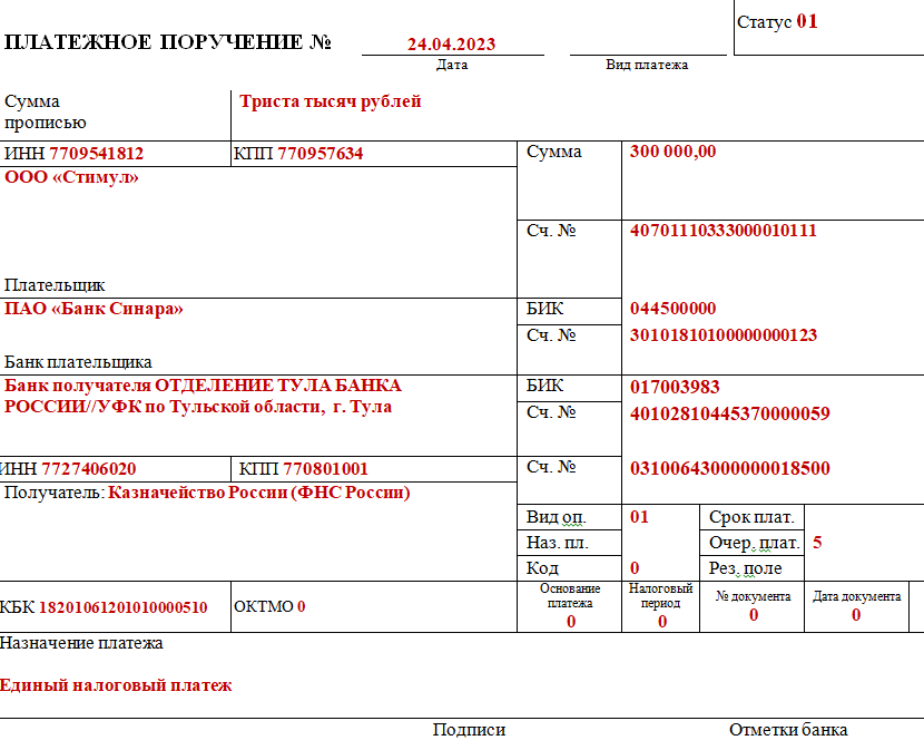 Пример. ООО «Стимул» должно заплатить до 28 апреля аванс по УСН за 1 квартал в размере 100 тысяч, 60 тысяч НДФЛ за сотрудников и 140 тысяч страховых взносов. Всего 300 000 рублей. Бухгалтер оформит платежку так:
