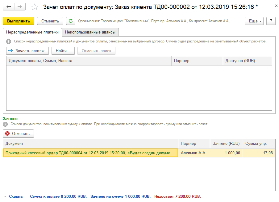 Регистрация предоплаты с зачетом аванса