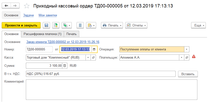 В результат в 1С будет автоматически создан документ «Взаимозачет задолженности». После этого зарегистрируем предоплату от клиента: введем на основании заказа ПКО. Пусть сумма аванса и предоплаты составляет 50% заказа, в этом случае сумма предоплаты составит 3100 руб (общая сумма заказа – 8200 руб, аванс – 1000 руб):