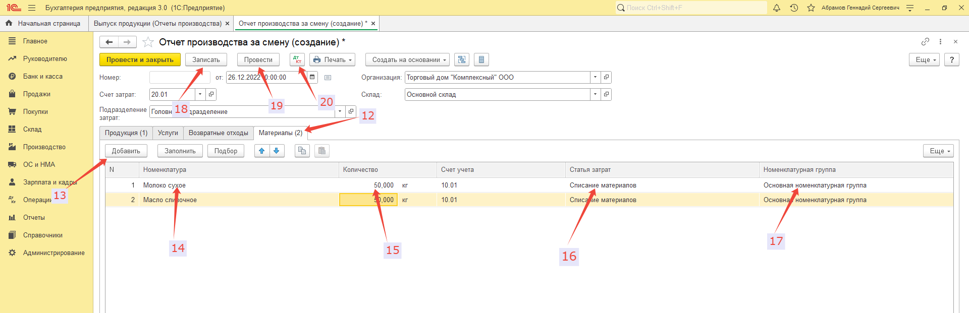 Чтобы закончить действия с данной формой, следует кликнуть на надписи «Записать» (18) и «Провести» (19).